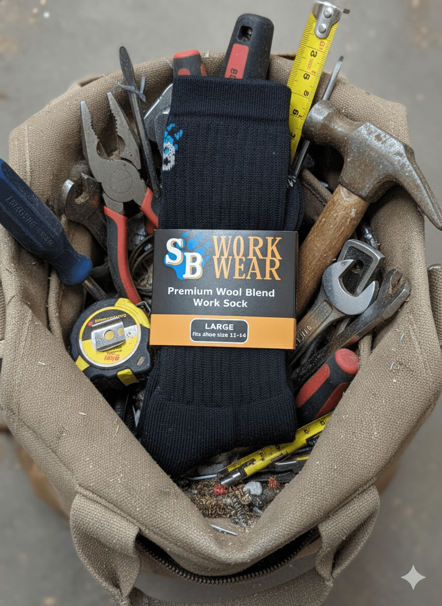 This is The SB Work Sock. The only sock any tradesperson will need. This is not your average sock! They’re the most comfortable to wear in your work boots, they don’t fall down (for real) and, they provide plenty of cushioning. With a tried and true blend of materials, The SB Work Sock keeps your feet cool and dry in summer and warm in winter. Durable to the highest standard, you’ll need and angle grinder to put a hole in them.